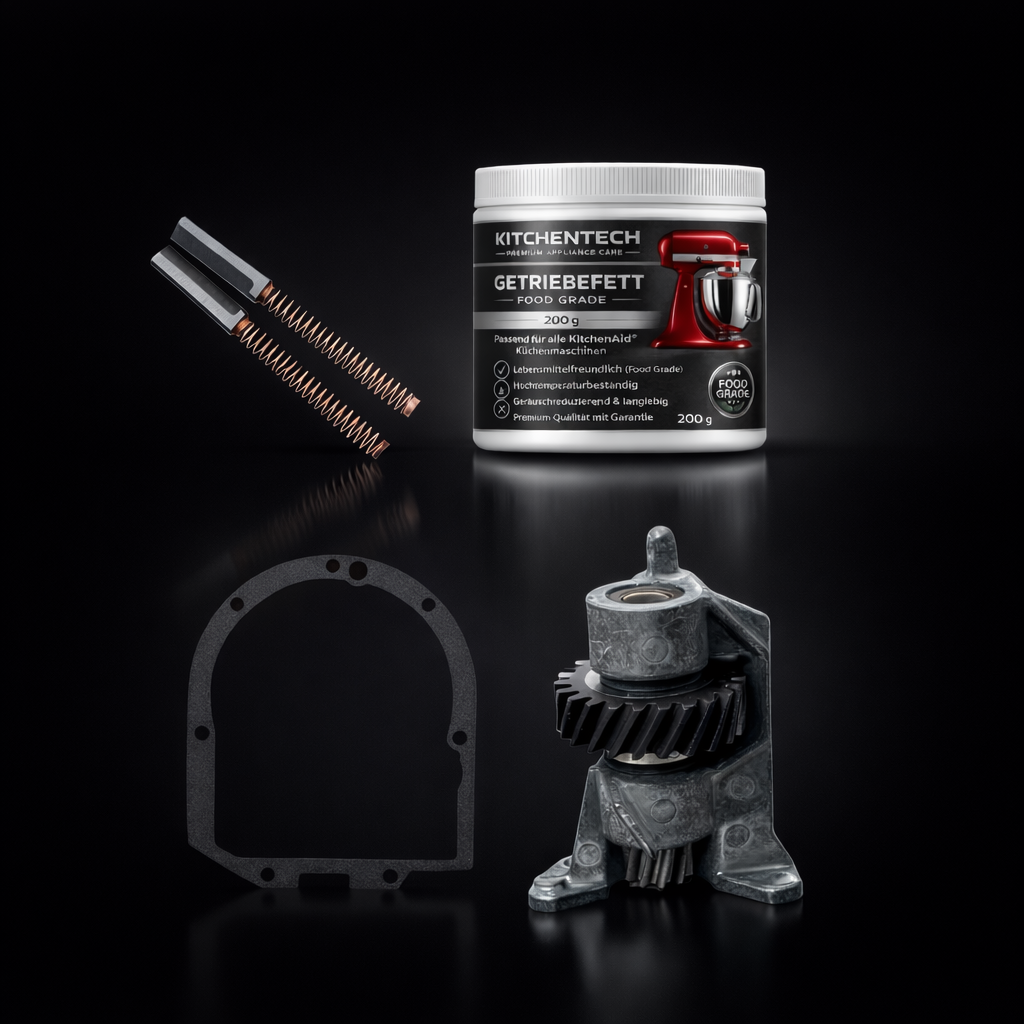 Dieses Getriebeset enthält alle wichtigen Komponenten zur Reparatur deiner Küchenmaschine: Zahnrad, Kohlebürsten, Dichtung und Spezialfett – perfekt aufeinander abgestimmt.